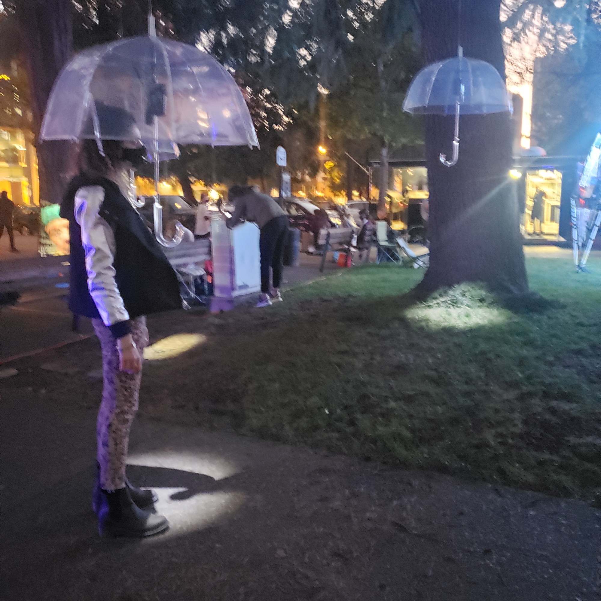 Business owners, unemployed people, students, parents, and other community members share their experiences of the past year. Parabolic-shaped umbrellas confine the sound to the space under the umbrella, creating both a socially distant but intimate moment between two strangers.