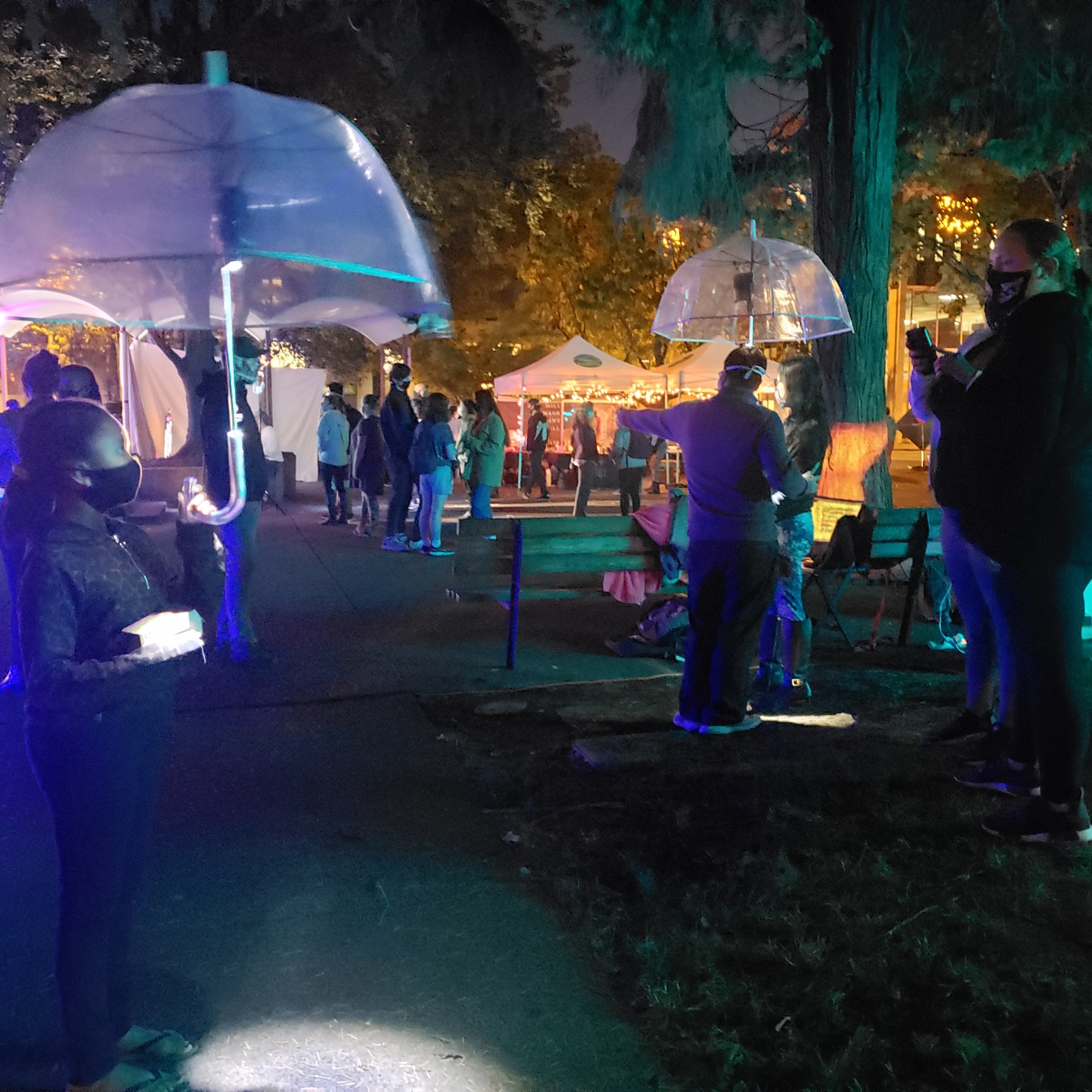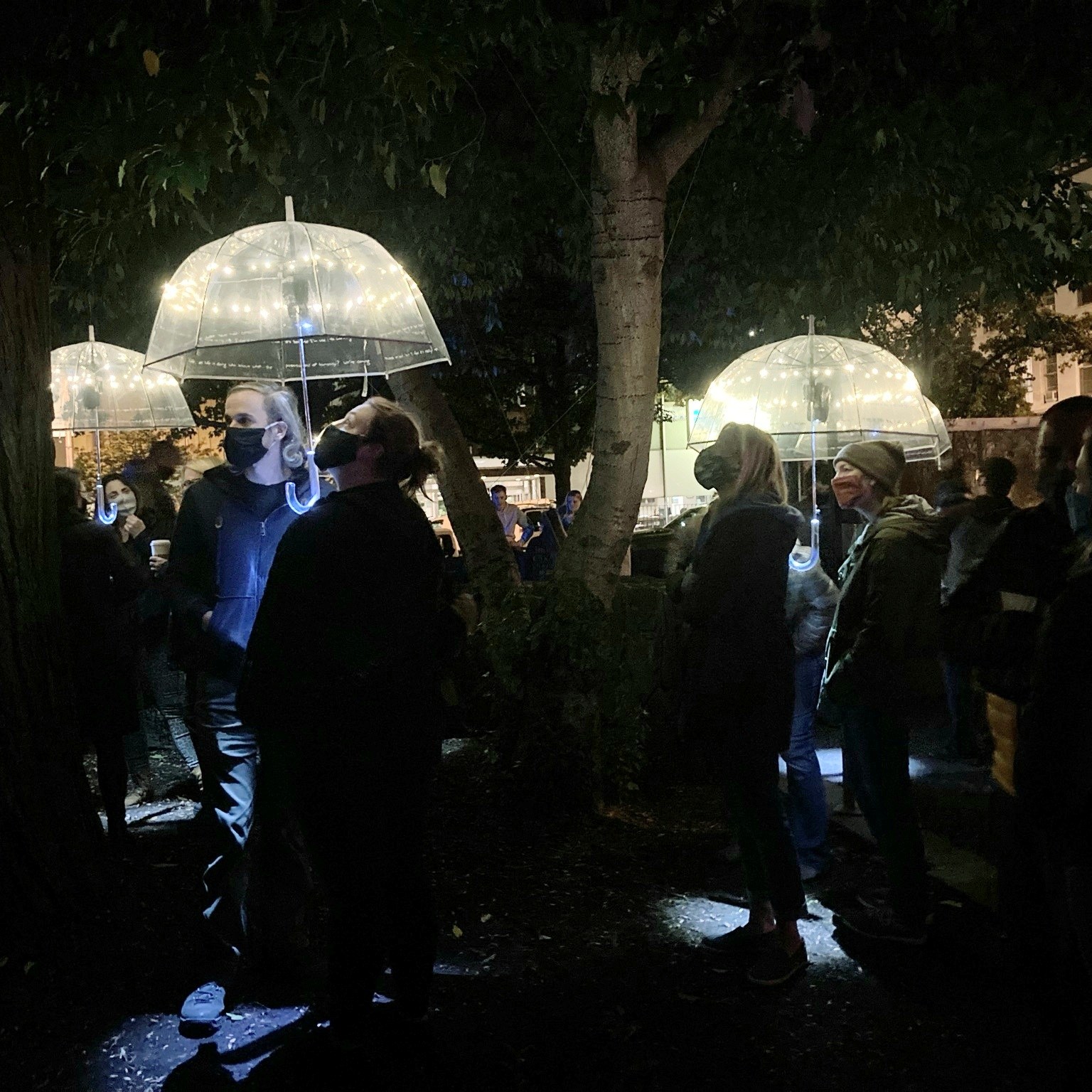 Unmasked is a storytelling installation featuring the voices of community members. Spotlights invite visitors to stand under umbrellas, spaced six feet apart, that tell the stories through small speakers.